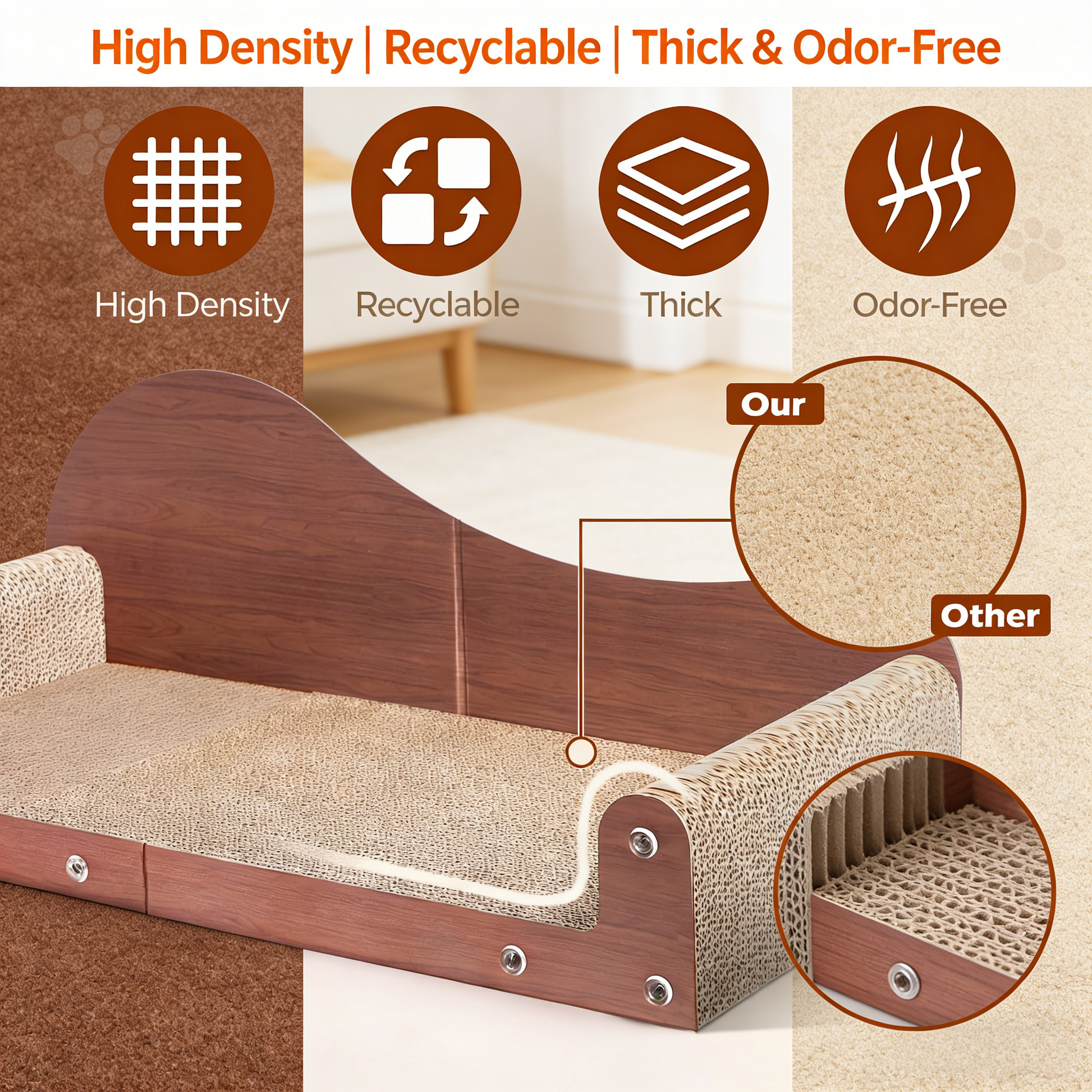Crafted from 100% recyclable corrugated cardboard and non-toxic corn-based glue, it’s free from harsh chemicals. Cats can safely scratch and leave their scent marks, making it a favorite spot for indoor felines.